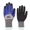 Luva de segurança tricotada em fios de vidro e fios sintéticos, revestimento duplo em borracha nitrílica na palma, face palmar e pontas dos dedos, acabamento tipo areia, punho com elastano.